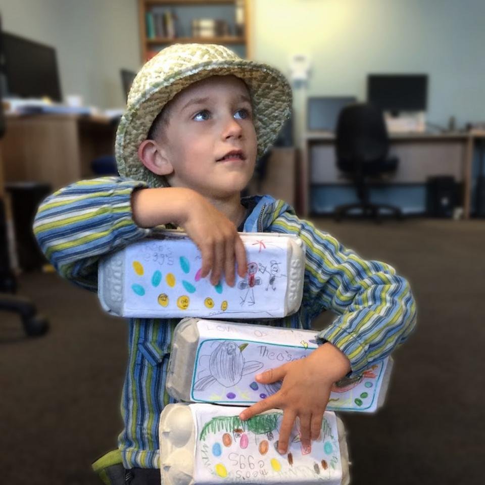 His son Theo, aged “four and three quarters”, decorates the boxes with his drawings of spaceships, roosters, eggs and Pippi Longstocking.