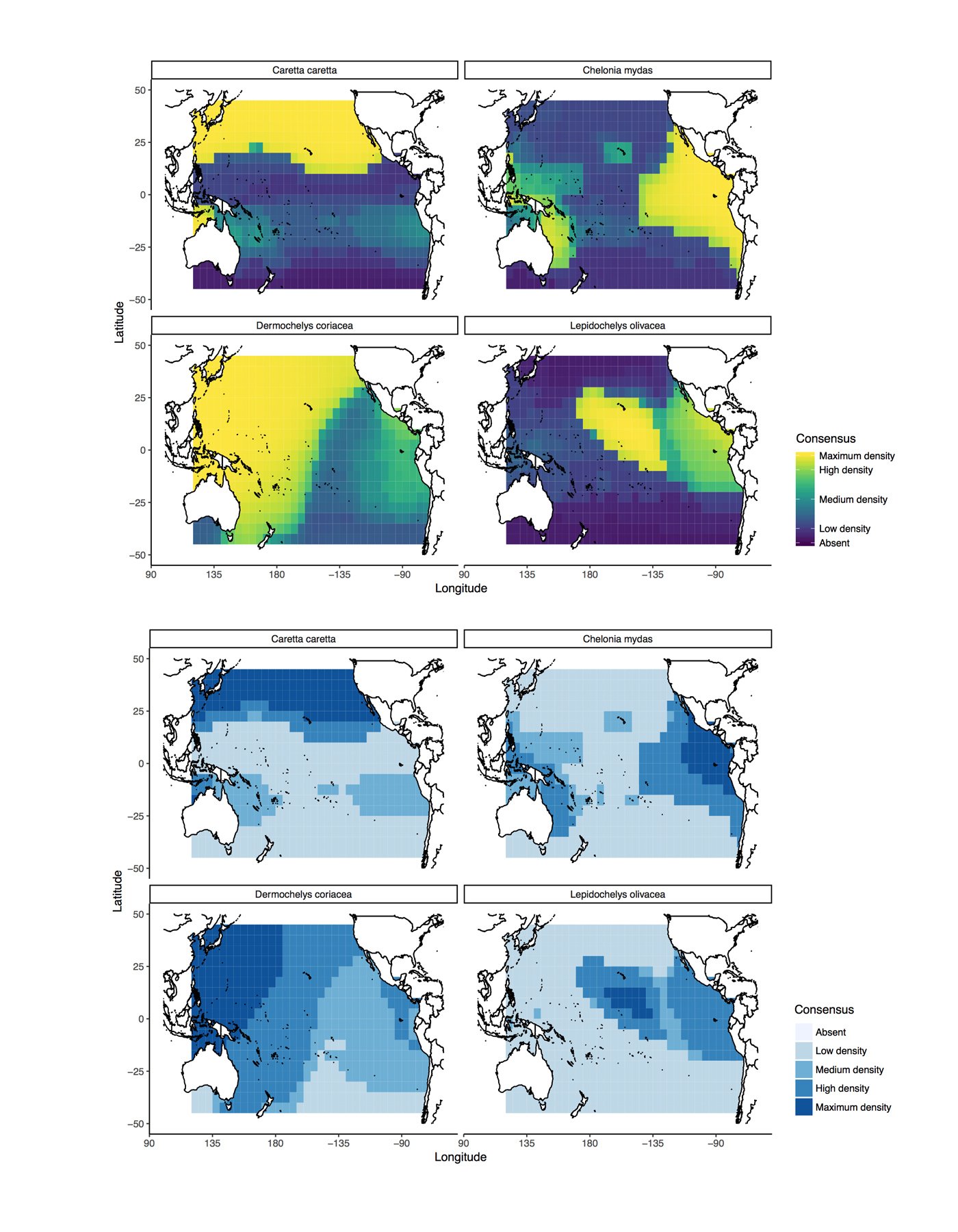 We developed an online survey method to allow experts contribute their knowledge independently. The experts coloured maps of the Pacific Ocean, according to their perceptions of turtle abundance. A statistical model was then used to combine the maps, producing estimates of relative abudance and the associated uncertainty.