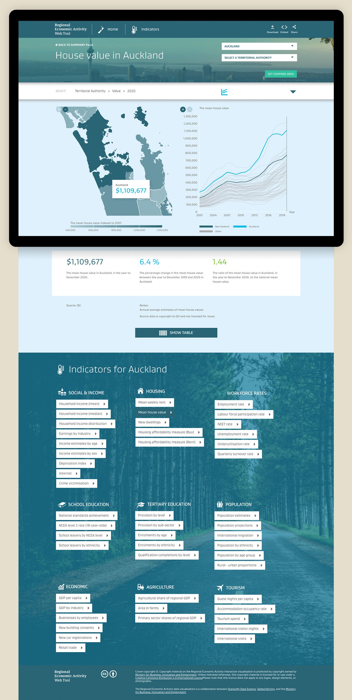 The Regional Economic Activity Report presents data on a broad range of economic activity in New Zealand. As part of the government’s Business Growth Agenda, Minister Steven Joyce wanted to make the report accessible to a wider audience by creating an online version. Regional and city council staff had also requested access to more detailed information, to inform their policy and planning around resources, permitting, and business management.